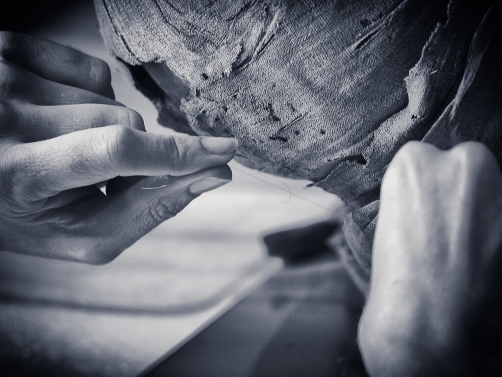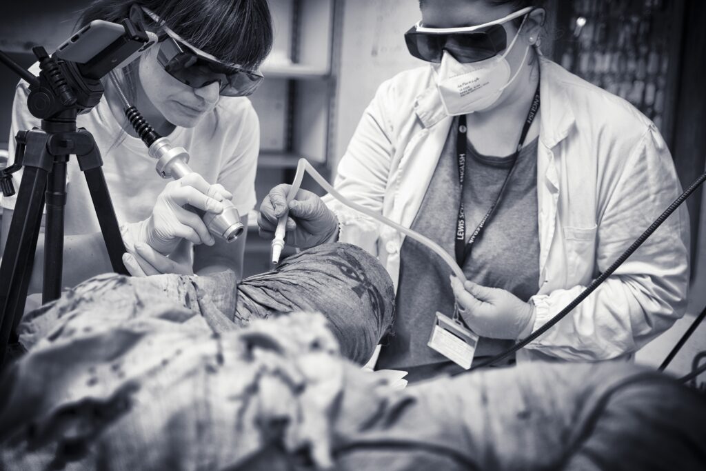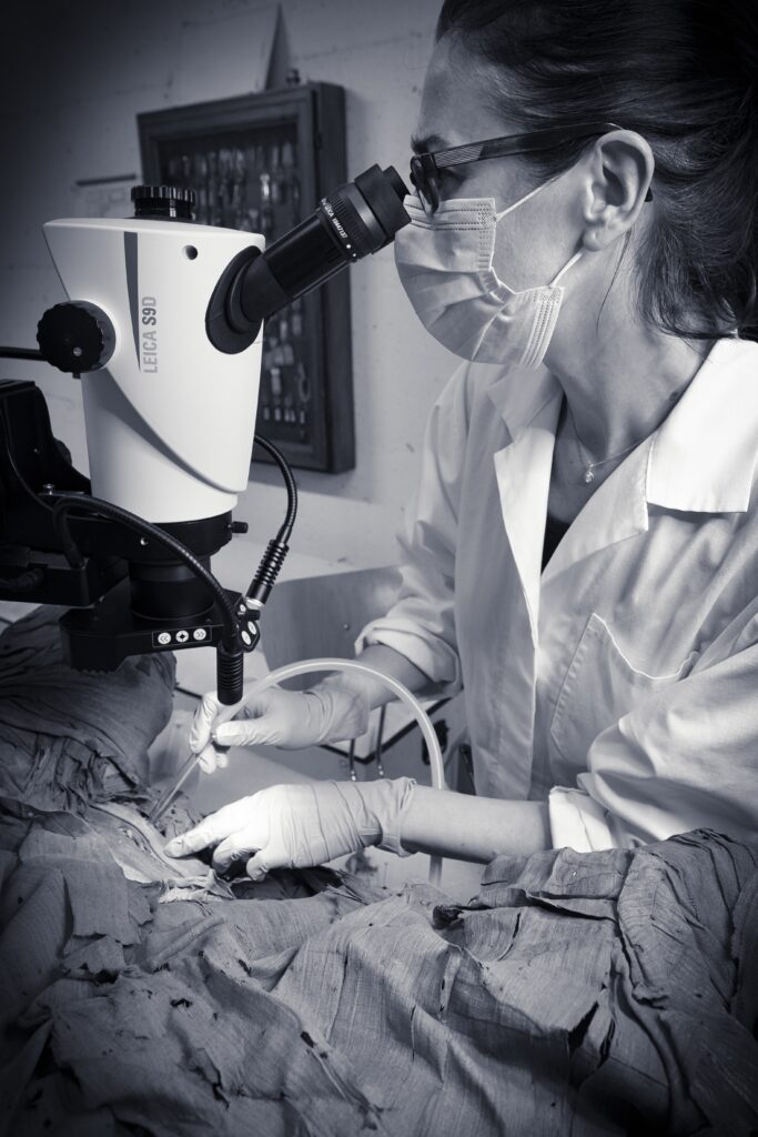The mummy, in fact, represents a rarity for the state of preservation of its complex textile stratigraphy and for the finds of considerable documentary value arrived from its funeral equipment. All the restoration choices, from cleaning to consolidation, required a reflection on the minimum intervention intended as a critical evaluation of the less invasive methods, in full respect of the organic materials to be maintained and preserved from future degradation. Thanks to the synergy of two methods (the traditional one using micro-suction combined with the LASER methodology), the cleaning intervention allowed the controlled removal of the deposits that made the details of the face painted on the bandages illegible. The subsequent phases have imposed a methodological reflection on the minimum intervention intended as a critical choice of the least invasive methods, in full respect of the archaeological materials to be kept in the state in which they arrive. All the textile consolidation was therefore based on the possibility of containing and stabilizing the degrades thanks to the coverage of the lacunous areas and in a state of fragility with a transparent silk veil and specially dyed in harmony with the color of ancient linen.
