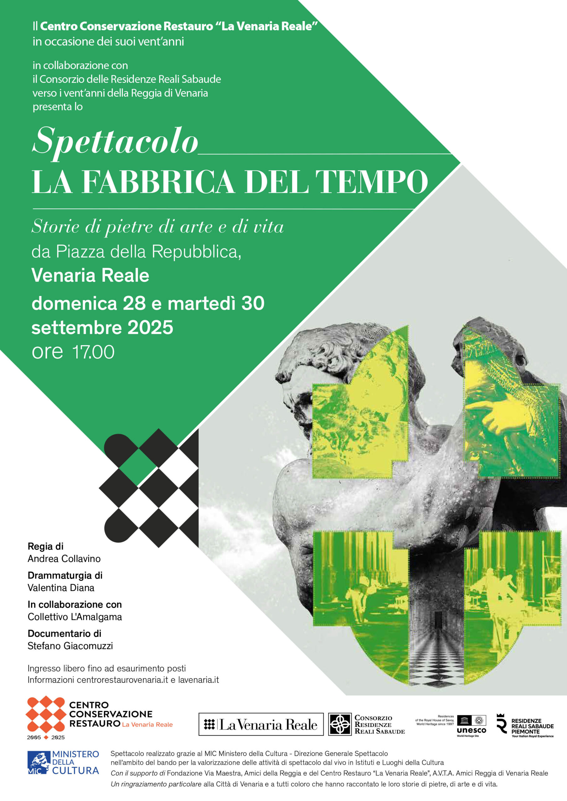 The Centro Conservazione Restauro ‘La Venaria Reale’ (CCR), as part of the celebrations for its 20th anniversary, in collaboration with the Consorzio delle Residenze Reali Sabaude, presents The factory of time. Stories of stones of art and life, a site-specific multidisciplinary performance, which recounts the extraordinary transformation of the Reggia di Venaria and its village – a UNESCO heritage site – through the language of theatre and the involvement of the community, transforming spaces into a diffused stage.