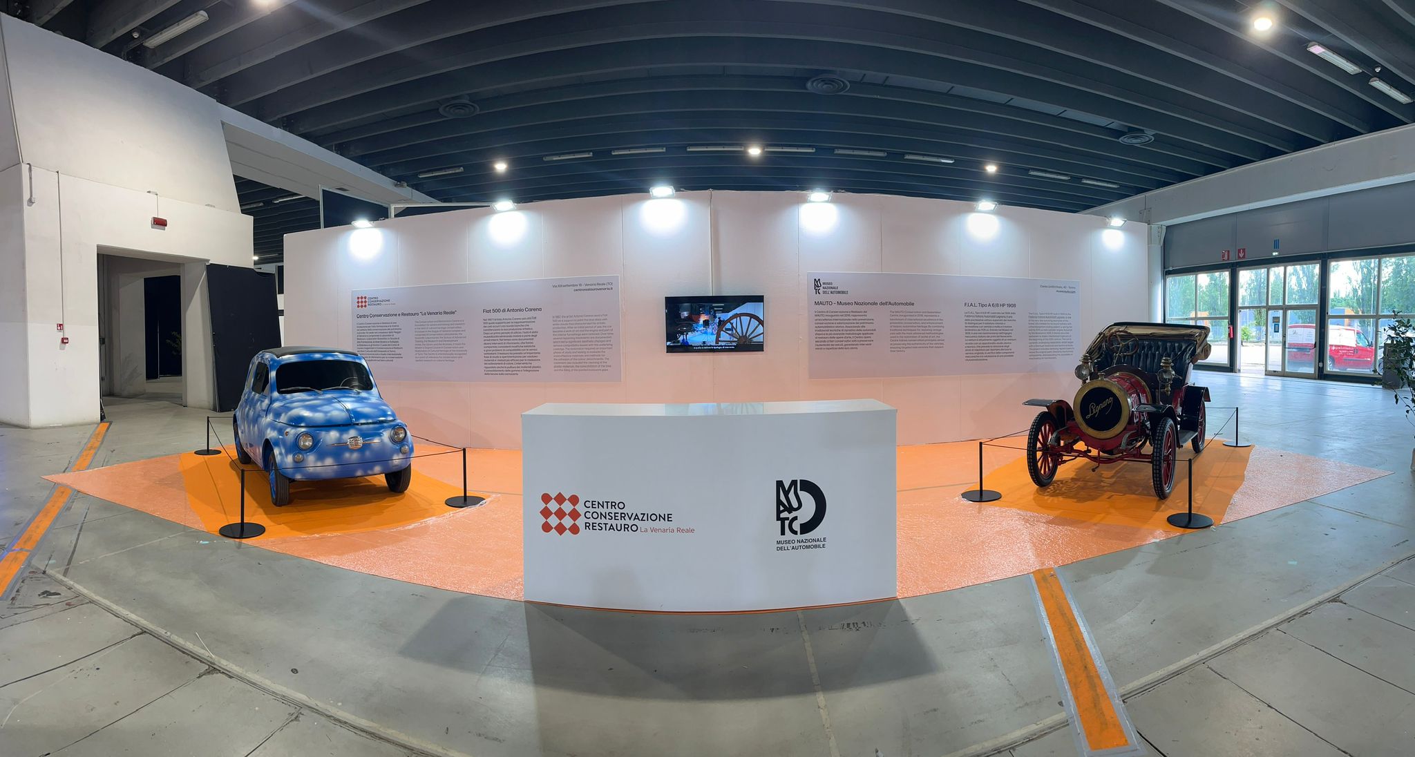 The FIAT 500 by artist Antonio Carena is presented to the public after restoration in the laboratories of the Centre, flanked by the F.I.A.L. Type A 6/8 HP of 1908 the National Automobile Museum.