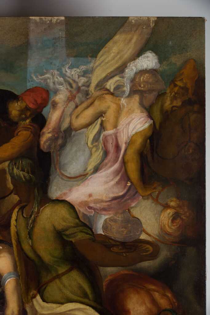 The work, executed around the middle of the 16th century, is distinguished by the formal elegance and sinuousness typical of Parmigianino models, combined with the materiality and chromatic brilliance of Venetian painting.