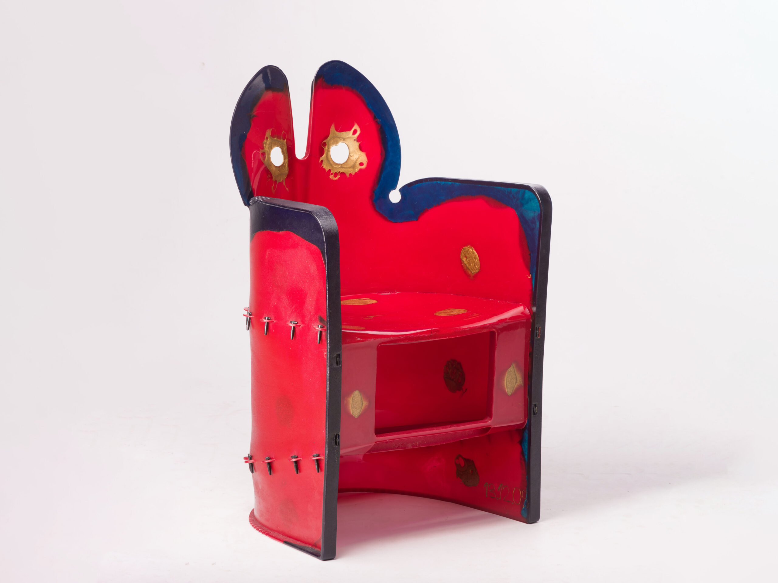 The armchair, in polyurethane elastomeric resin colored in paste with nylon pins, had widespread and wide fractures on the seat and back.