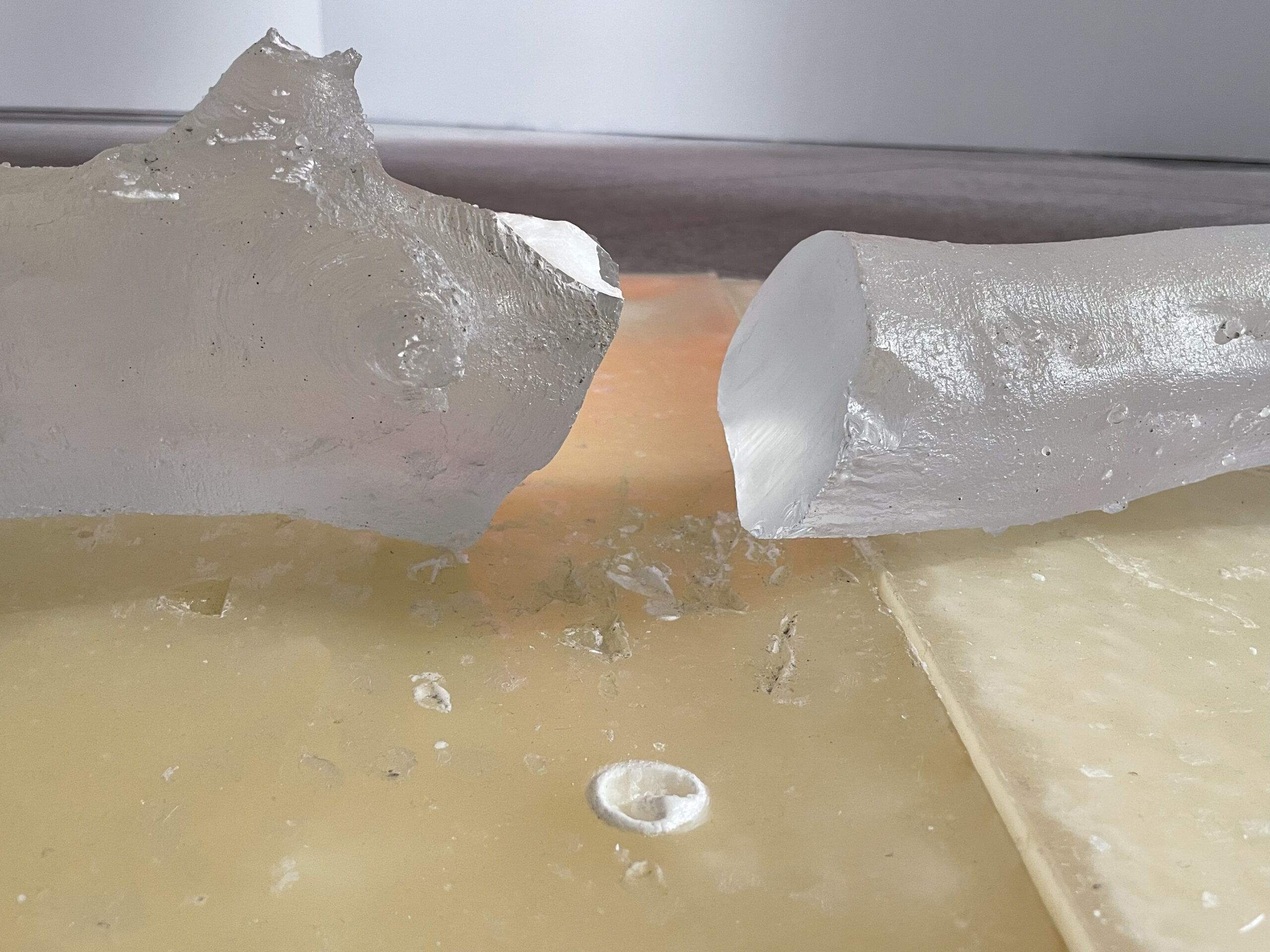 The intervention provided for the restoration of the surface flatness of the damaged paraffin sheets, on which there were depressions and scratches. In addition, some fragments that had become detached were re-adhesive on the crystal zoomorphic element. The white and smooth plaster plaster plasters, due to a previous restoration intervention, which were located on one end of a crystal element, were then removed.