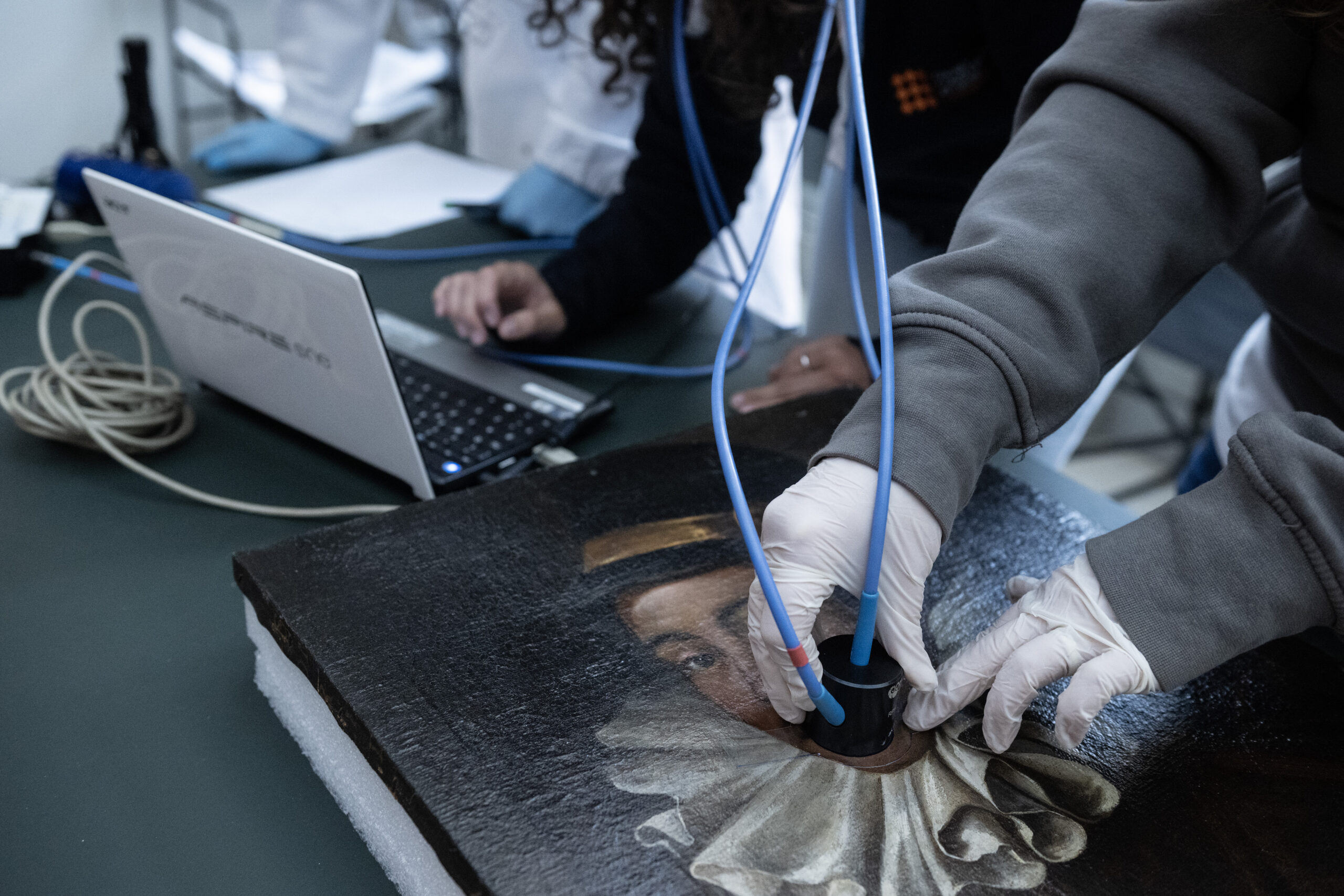Il team scientifico del CCR – affiancato da alcuni restauratori del Centro e da professionisti dell’Università degli Studi di Milano, dell’Università di Milano-Bicocca e di DeepTrace Technologies, spin-off della IUSS-Scuola Universitaria Superiore Pavia – ha eseguito analisi non invasive sull’opera, offrendo al pubblico uno sguardo inedito sui materiali e sulle tecniche utilizzate dall’artista. Grazie alla scienza, è possibile esplorare tanto gli strati più superficiali quanto quelli più profondi del dipinto, portando alla luce dettagli nascosti e offrendo una nuova lettura del ritratto nella sua complessità.
